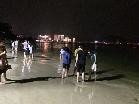 經(jīng)過近三小時的車程,我們順利抵達巽寮灣鳳池島度假村。海景房配超大陽臺,視野開闊,無敵海景一覽無余。晚上,饑腸轆轆的我們享用了當?shù)氐霓r(nóng)家菜,盤盤掃個精光。晚飯后,夜幕下,大伙漫步酒店私家沙灘,聊天、談心、吹海風、沖海浪、抓螃蟹、撿貝殼,涼風習習,十分愜意,久久不愿離去。