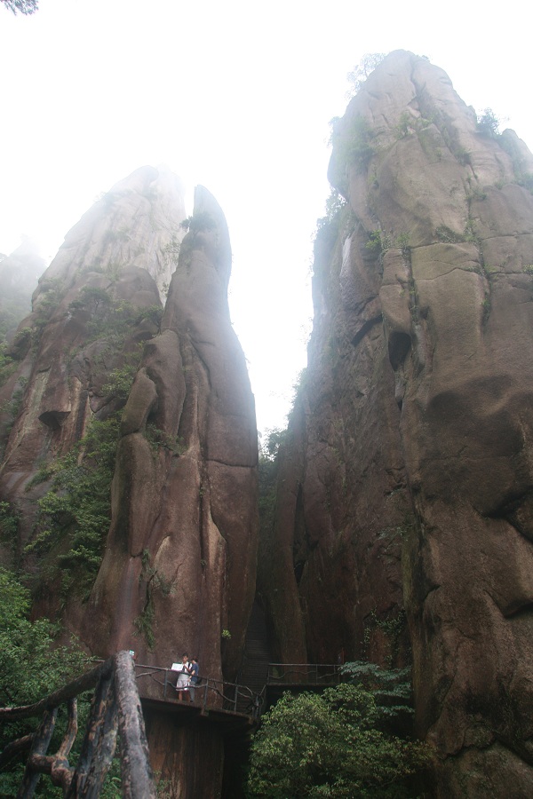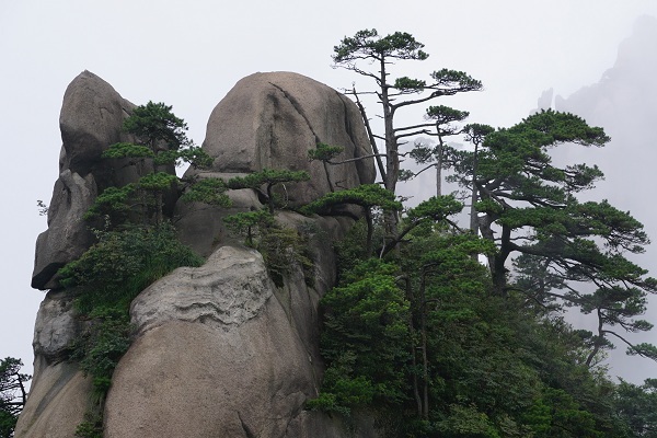 三清山的特點(diǎn)之三便是漫山遍野的蒼松古木。它們或昂首屹立于巔峰,或俯首懸垂于崖壁,或盤根伸出巖隙,或交叉纏繞于山谷,大都以其形態(tài)命名,如“迎客松”、“華蓋松”、“連理松”、“姐妹松”、“鳳凰松”等等。漫步棧道,沿途1800多棵古松,遠(yuǎn)可望,近可撫;或倚道而斜,或臨淵而生,或傍峰而立;蒼老遒勁,儀態(tài)萬方,古靈精怪。它們的生命力如此強(qiáng)大,旺盛,探究其原因,或得益于三清山的花崗巖地貌,它巖基裂隙多,透水性強(qiáng),蓄水量大,為樹木的生長(zhǎng)提供了充足的水源保障。在棧道上行走,你會(huì)發(fā)現(xiàn)很多松木從棧道預(yù)留的基縫里伸出來,毫發(fā)未傷,在這樣的地方,人們需要低頭才能通過前行。當(dāng)年修筑凌空棧道,工人未傷及一樹一木,才使大家看到今天的風(fēng)景,當(dāng)?shù)卣畬?duì)古松木的保護(hù)和愛惜可見一斑。